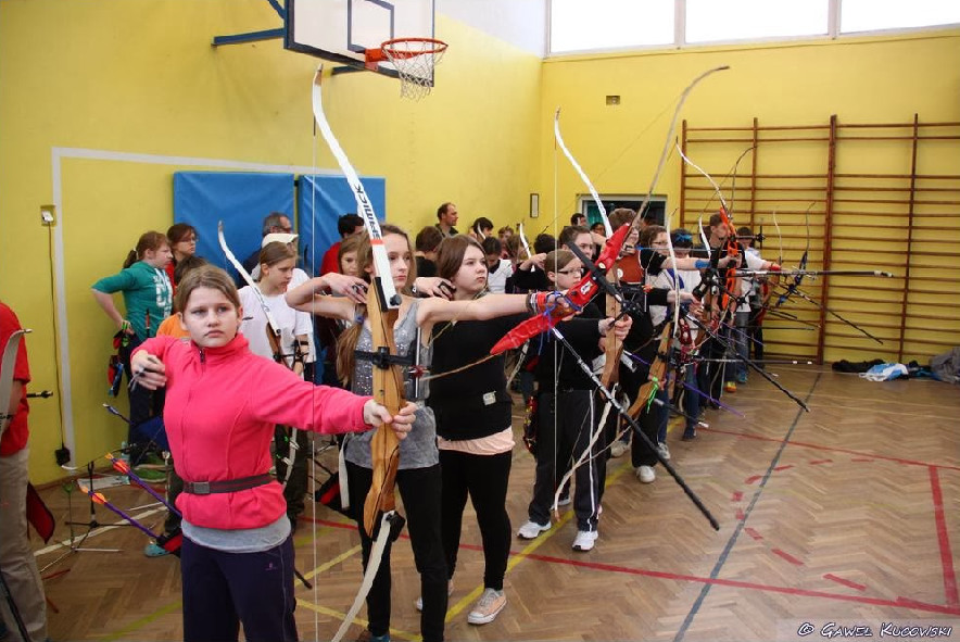 To tyle historii, teraz może o "moim" łucznictwie. Sama startuję w kategorii Młodzik (a w zasadzie Młodziczka ;-)) czyli to kategoria wiekowa zaraz po dzieciach. Chyba najtrudniejszym okresem jest pierwsze kilka treningów, gdzie nie od razu dostajemy do ręki łuk. Najpierw trzeba poćwiczyć postawę i sposób wypuszczania wirtualnej strzały „na gumie”, takiej rehabilitacyjnej. Robi się to po to aby wyrobić pewne nawyki i zapomnieć o tym co się do tej pory widziało w filmach. Potem dostaje się łuk, tzw. Patyk, na którym oddaje się swoje pierwsze strzały. To właśnie jest chwila gdzie zaczynamy czuć czy chcemy się dalej w to bawić czy nie. Mówię Wam, fajne uczucie jak się „przysunie” pierwszy raz w ścianę zamiast w tarczę. Po około 3 miesiącach jak już rozumiesz o co w tym chodzi, możesz zacząć brać udział w pierwszych lokalnych zawodach, żeby się sprawdzić z innymi zawodnikami. Oczywiście nie jest tak różowo, że będzie się już w pierwszej dziesiątce, ale po roku czasu, jeżeli jest się wytrwałym można już przynosić do domu pierwsze statuetki i medale, a w tym czasie zdążysz przetestować już kilka klubowych łuków o różnym stopniu twardości i z różnymi celownikami. A co znaczy wytrwałość w tym sporcie? … 3 razy w tygodniu jednak wypadałoby się stawić na trening, w domu czasem trzeba potrenować „na gumie” i oczywiście "pompeczki". Jestem raczej drobną dziewczyną i nie uwierzylibyście, ale potrafię zrobić 25 pompek, czym zaskakuję moich rówieśników na WF-ie. Trening , ten właściwy, trwa z reguły 90min i odbywa się albo na torze łuczniczym w Parku Skaryszewskim albo na Sali gimnastycznej w SP60 na Zbaraskiej – w zależności od pory roku.