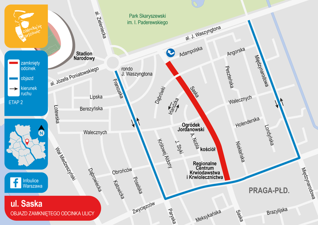 Prace zostały podzielone na dwa etapy, tak aby utrzymać dojazd do ulic Adampolskiej i Dąbrówki. W pierwszym etapie wyłączone z ruchu będą odcinki od al. Waszyngtona do Adampolskiej i od Angorskiej do Zwycięzców. W tym czasie z ul. Adampolskiej będzie można wyjechać w lewo na ul. Saską i dojechać do skrzyżowania z ulicami Dąbrówki i Angorską. W drugim etapie zamknięty będzie odcinek od ul. Adampolskiej do Zwycięzców: wyjazd z ul. Angorskiej będzie możliwy w prawo do bocznej jezdni al. J. Waszyngtona, utrzymany będzie także przejazd w ciągu ulic Dąbrówki i Angorskiej. Objazdy zostaną poprowadzone al. J. Waszyngtona, Międzynarodową i Zwycięzców oraz al. J. Waszyngtona, Francuską i Zwycięzców.