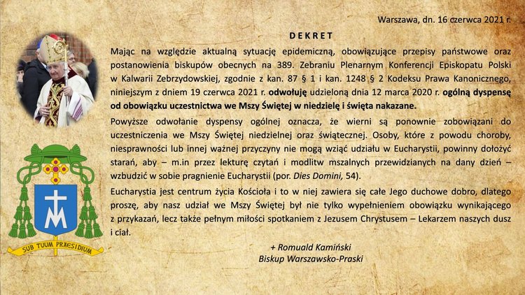 Dekret o odwołaniu dyspensy od obowiązku uczestnictwa w niedzielnej i świątecznej Mszy Świętej w Diecezji Warszawsko-Praskiej.