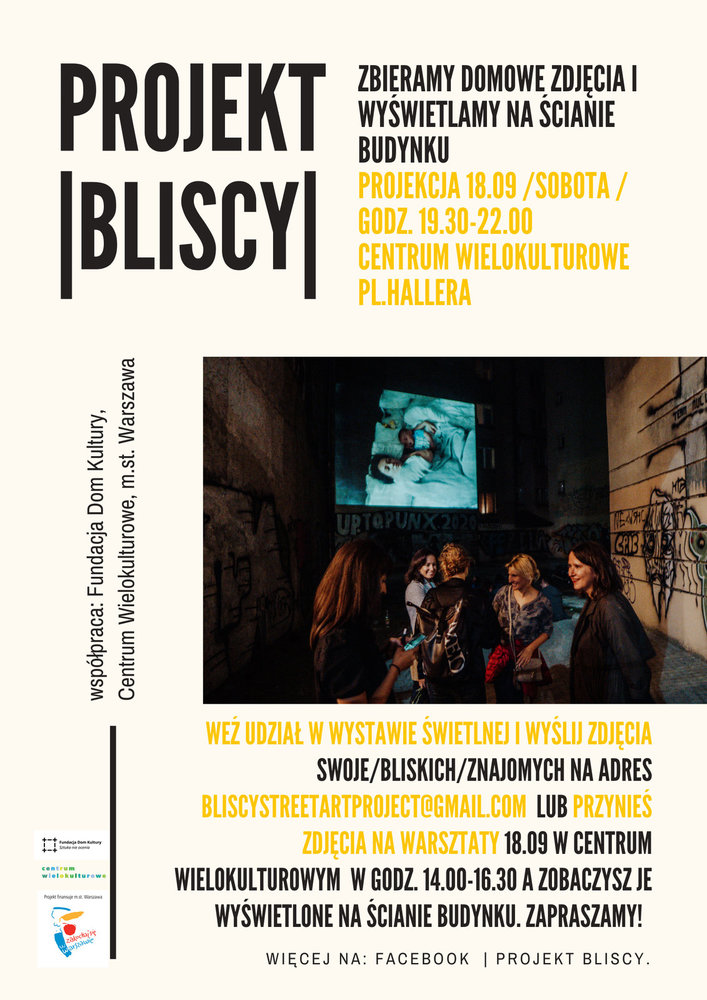 Projekt B L I S C Y wraca po długiej przerwie. W sobotę, 18 września zapraszamy na nową odsłonę projektu BLISCY na warszawski Plac Hallera, gdzie po raz kolejny wyświetlimy zdjęcia przekazane nam przez mieszkańców – zdjęcia rodziny, przyjaciół lub swoje, zdjęcia z małych, prywatnych sytuacji łączymy w nową opowieść i wyświetlamy w dużej skali – na fasadzie Centrum Wielokulturowego. Pojawiając się w przestrzeni publicznej, fotografie napełnią ją intymnymi historiami bliskich i dalekich sobie ludzi, tworząc obraz oparty o domowe portrety mieszkańców Warszawy. Kim są? Jak wyglądają? Jak mieszkają?