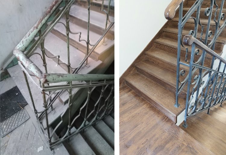 Udało nam się przekonać inwestora do odtworzenia, zgodnie ze stanem pierwotnym, drewnianych stopni i podestów (choć w projekcie planowano okładziny schodowe z granitu polerowanego). Modernizacja klatek schodowych przebiegała z dużą dbałością o szczegóły i estetykę. Wykonane na nowo balustrady, choć podwyższone w stosunku do oryginału, powtarzają motyw historyczny. Wykonawca spójnie dobrał również stolarkę drzwiową mieszkań, a posadzki na parterze, w miejscach najbardziej narażonych na codzienne użytkowanie, wykończył szaro-białymi płytkami ułożonymi w "karo", co jest nawiązaniem do praskich wzorów z epoki.