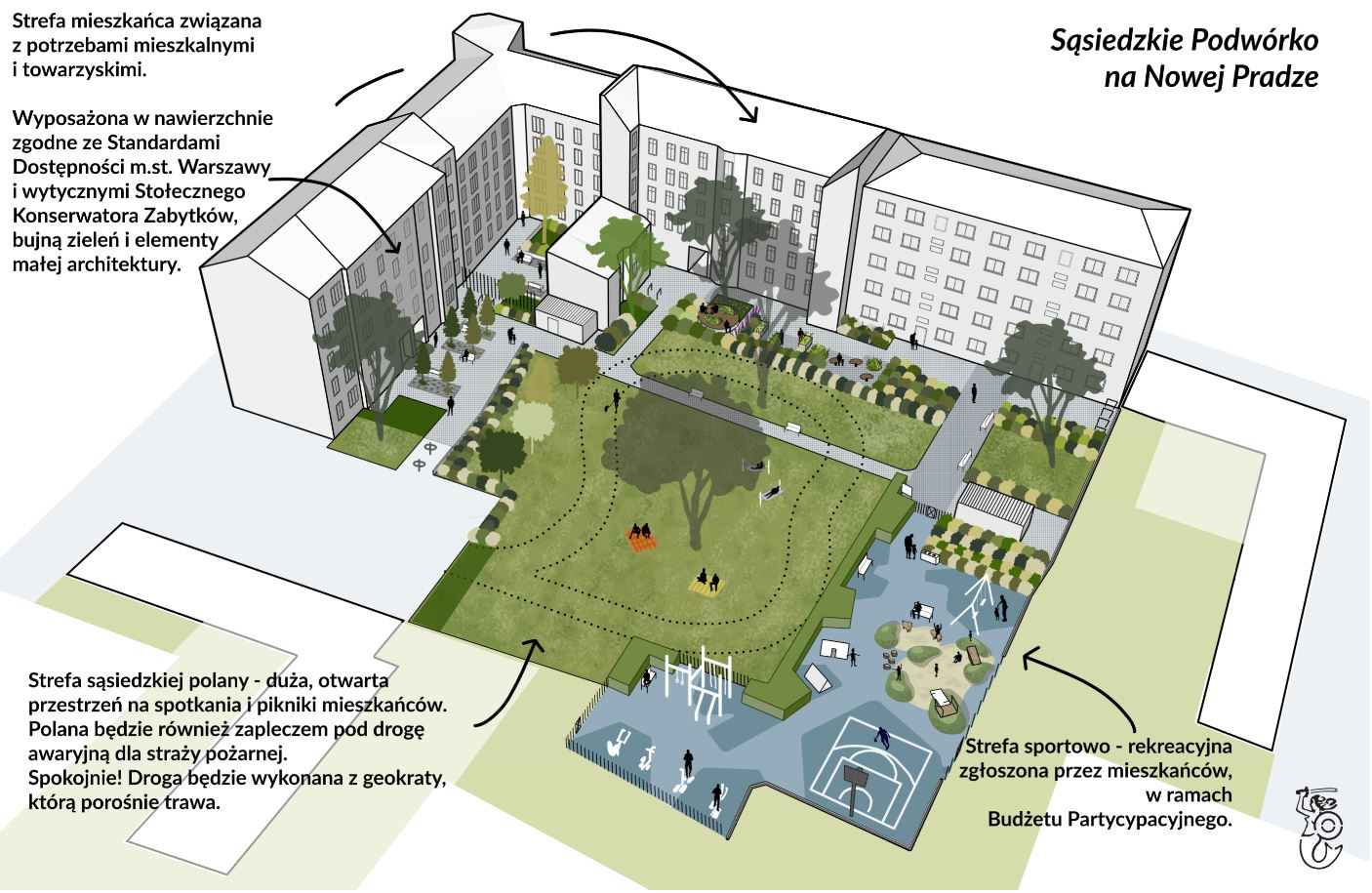 Najbardziej istotne zmiany jeszcze przed nami - teren podwórka zostanie zmieniony, będzie integrował różne grupy mieszkańców, uwzględniając ich potrzeby. Zostaną zbudowane nowe alejki i chodniki, po których łatwiej będzie się poruszać osobom niepełnosprawnym, poruszającym się na wózkach. Na prośbę mieszkańców został w projekcie zapewniona możliwość dojazdu karetki lub większego auta w celu przeprowadzki.ÂÂ