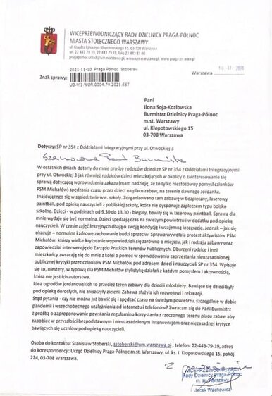 W tej sprawie rodzice dzieci uczęszczających do SP nr 354 poprosili o pomoc radnego Jacka Wachowicza, który w złożonej interpelacji zwraca się do Burmistrz dzielnicy z prośbą o zaproponowanie powstania nowego regulaminu rzeczonego terenu, aby zapobiec na przyszłość bezpodstawnym i nieuzasadnionym interwencjom oraz niezasadnej krytyce bawiących się uczniów pod opieką nauczycieli, której doświadczyli przez PSM Michałów.