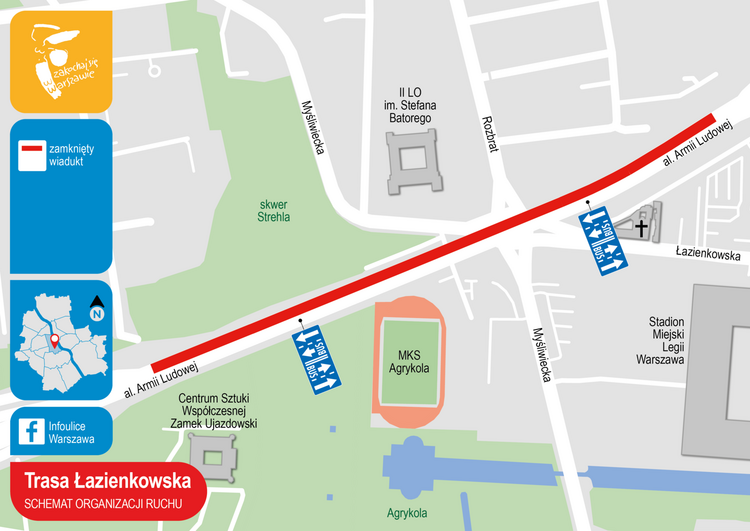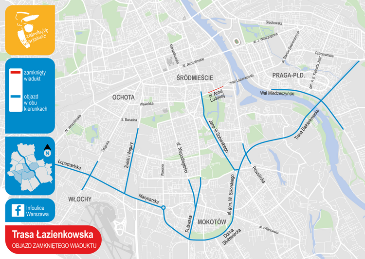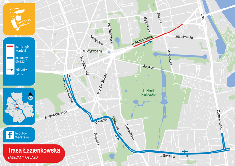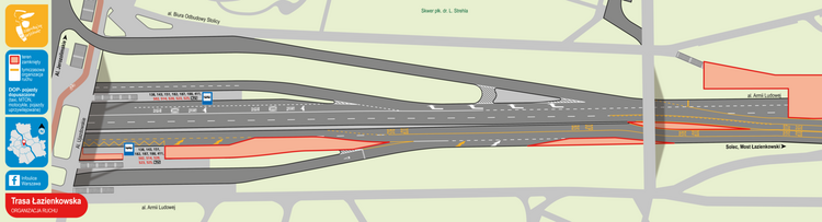Na odcinku Trasy Łazienkowskiej od ronda Jazdy Polskiej do węzła z Wisłostradą wprowadzony zostanie zakaz wjazdu pojazdów ciężarowych oraz pojazdów o szerokości powyżej 2,2 m. Zalecany objazd dla tych pojazdów prowadzi ulicami: L. Waryńskiego, Goworka, Spacerową i J. Gagarina do ul. Czerniakowskiej.