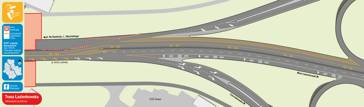 Natomiast na wlocie ul. L. Waryńskiego na rondo od strony pl. Konstytucji będzie tylko jeden pas do skrętu w lewo na Trasę Łazienkowską (skrajny). Z pasa środkowego w lewo skręcić będą mogły tylko autobusy i pojazdy dopuszczone.