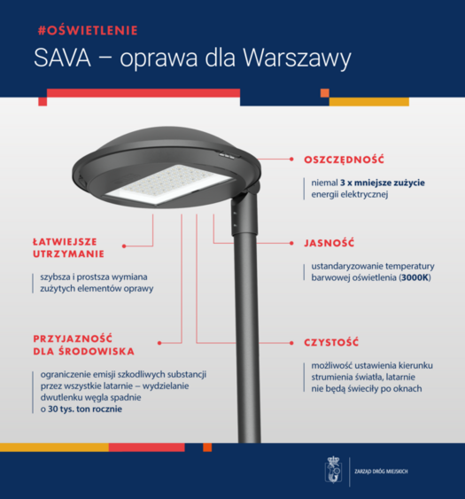 Montowane oprawy zostały zaprojektowane specjalnie dla Warszawy. Stąd nie dziwi nazwa, jaką otrzymały - SAVA. Przypominają mały latający spodek, a nowoczesny wygląd zawdzięczają kształtowi kopuły ”future proof”, w której mieszczą się wszystkie podzespoły składające się na działanie lampy. Sercem oprawy jest odpowiednio dostosowany do niej układ optyczny, pozwalający na ustawienie odpowiedniej temperatury barwowej światła.