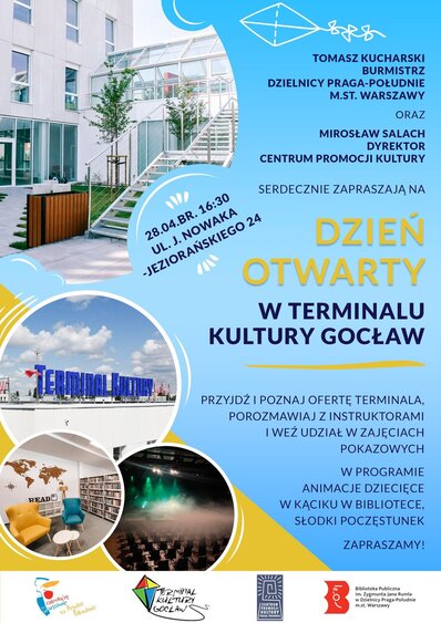 W czwartek 28 kwietnia br. Terminal Kultury Gocław, czyli filia Centrum Promocji Kultury zaprasza na Dzień Otwarty. Będzie okazja zapoznania się z bogatą ofertą kulturalną oraz zwiedzenie nowoczesnych wnętrz. Tego dnia dla dzieci przygotowano liczne animacje. Początek o godzinie 16.30.
