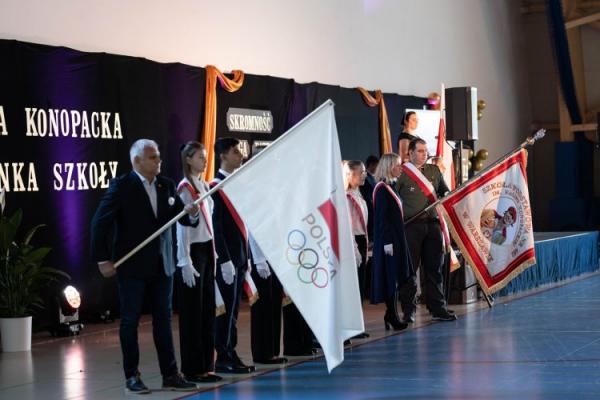 Uczniowie z Gocławia pod sztandarem Haliny Konopackiej