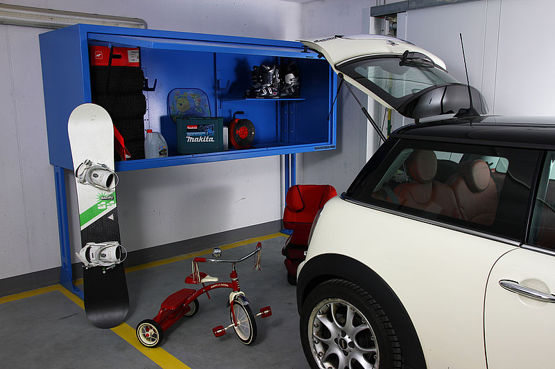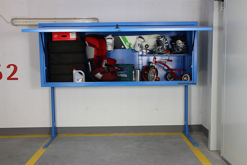 Garażowy Box to dodatkowa przestrzeń w garażu podziemnym. Wygodny i ekonomiczny do przechowywania akcesoriów do eksploatacji samochodu, narzędzi, sprzętu sportowego oraz wszelkich innych rzeczy, które nasza wyobraźnia zdoła pomieścić w boxie. Wyposażony w półkę, uchwyty, zawiesia, zamykany na klucz. Bezpieczny i funkcjonalny. Do wyboru w dwóch rozmiarach, w różnych kolorach.