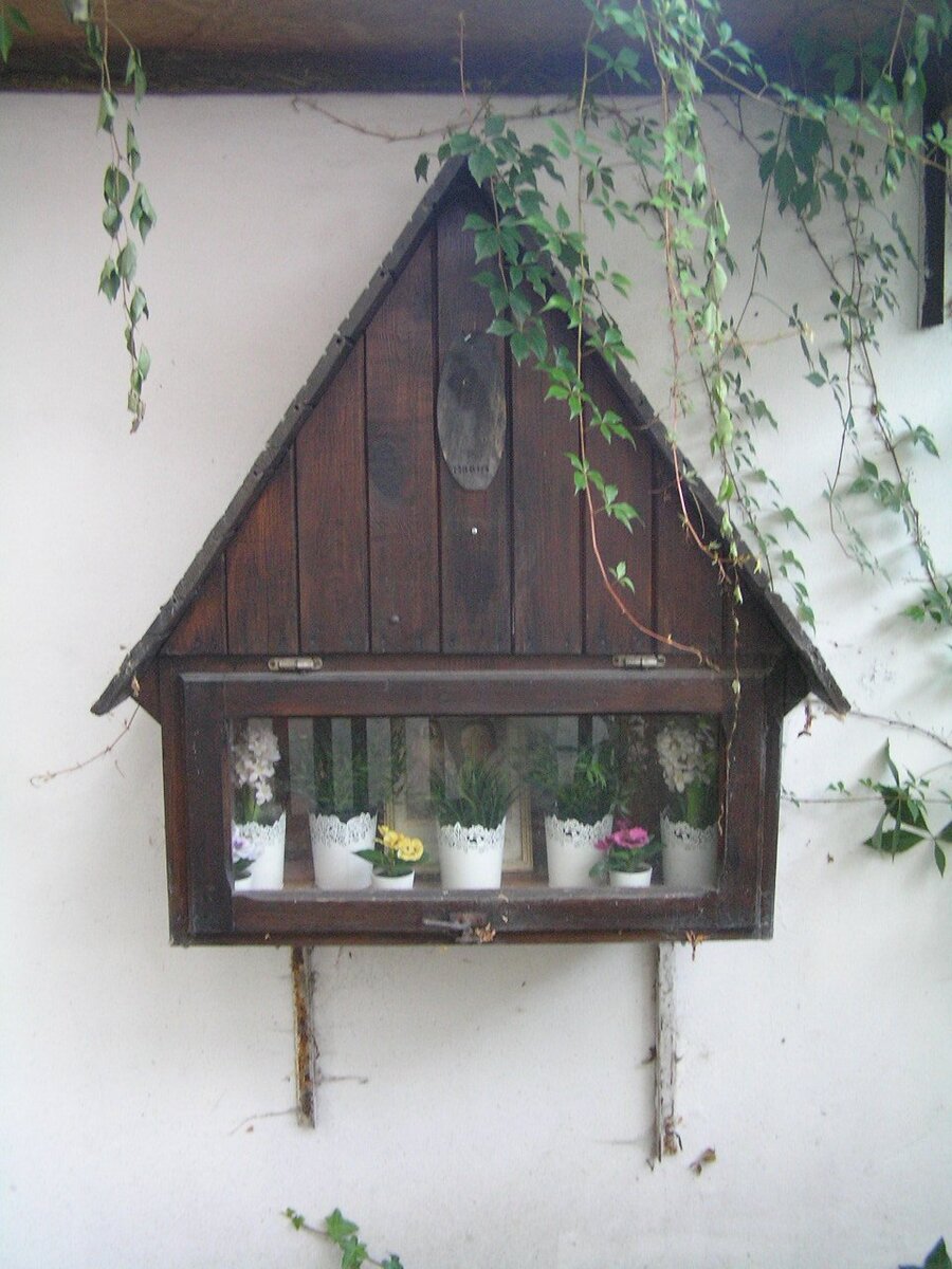 Kapliczka drewniana zawieszona na podwórku przy ulicy Zaokopowej 4/6 na Nowej Pradze w dzielnicy Praga Północ w Warszawie.