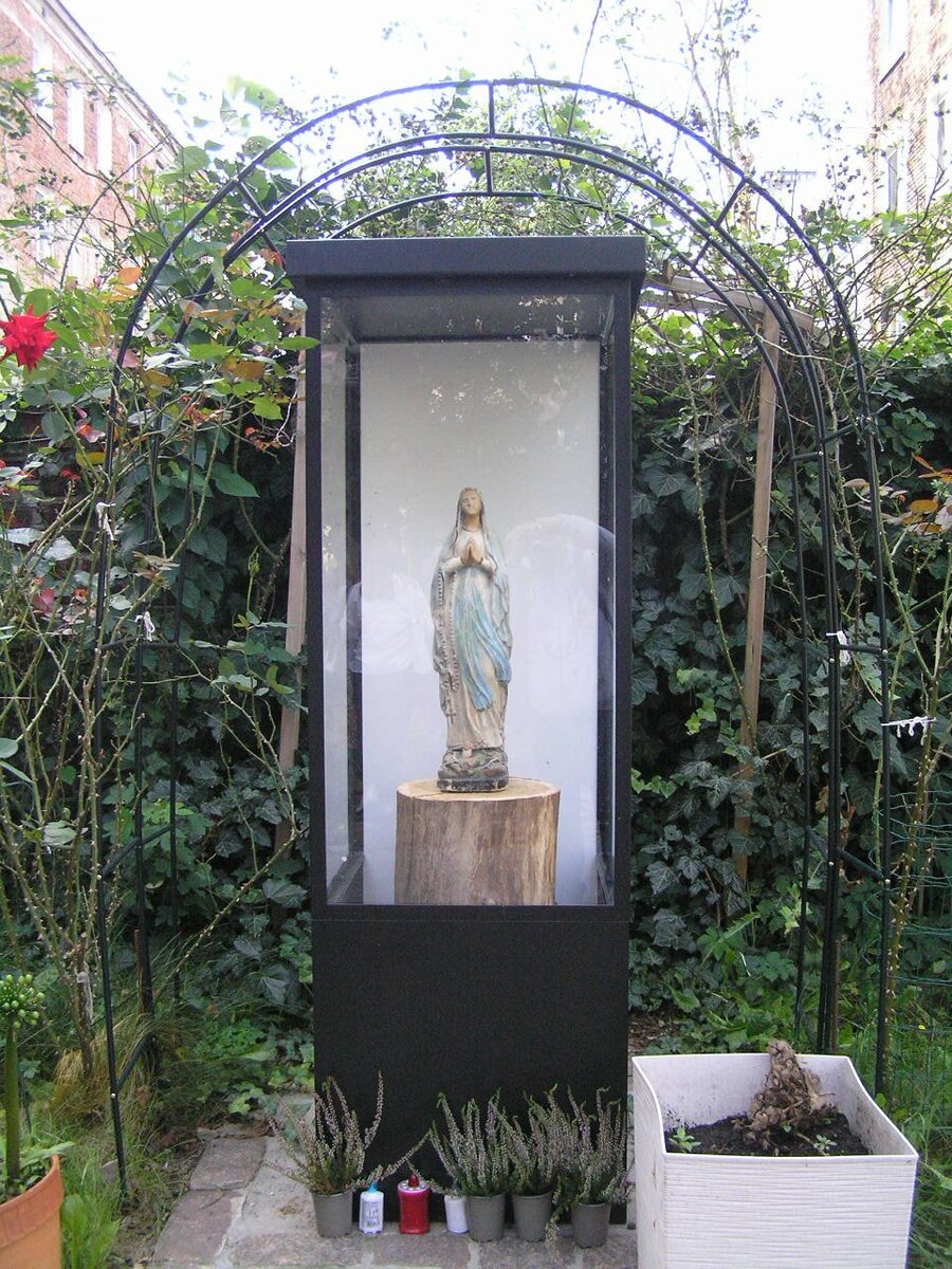 Figura Matki Bożej umieszczona w kapliczce trafiła w Pragę przywieziona przez babcię jednej z lokatorek. Licząca blisko 100 lat figura w wyniku nieszczęśliwego wypadku była bardzo poważnie uszkodzona. Dzięki determinacji mieszkanek, Anny i Karoliny, przy wsparciu - również finansowym Krzysztofa Michalskiego ze Stowarzyszania Porozumienie Dla Pragi oraz dzięki talentowi pani Elżbiety Zawadzkiej z Galeria Szuflada w 2021 roku figurę udało się odrestaurować.
