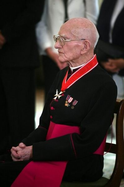 Do legendy przeszła opowieść o bohaterstwie, którym się wykazał podczas Powstania Warszawskiego gdy jako 37-letni, barczysty kapitan w sutannie, wyniósł z płonącej katedry św. Jana cudowną figurę Chrystusa Ukrzyżowanego z kaplicy Baryczków.