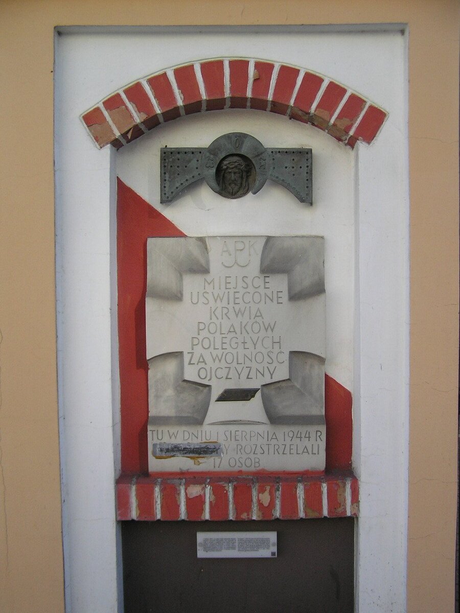 MIEJSCE UŚWIĘCONE KRWIĄ POLAKÓW POLEGŁYCH ZA WOLNOŚĆ OJCZYZNY. TU 1 SIERPNIA 1944 R. HITLEROWCY ROZSTRZELALI 17 OSÓB."