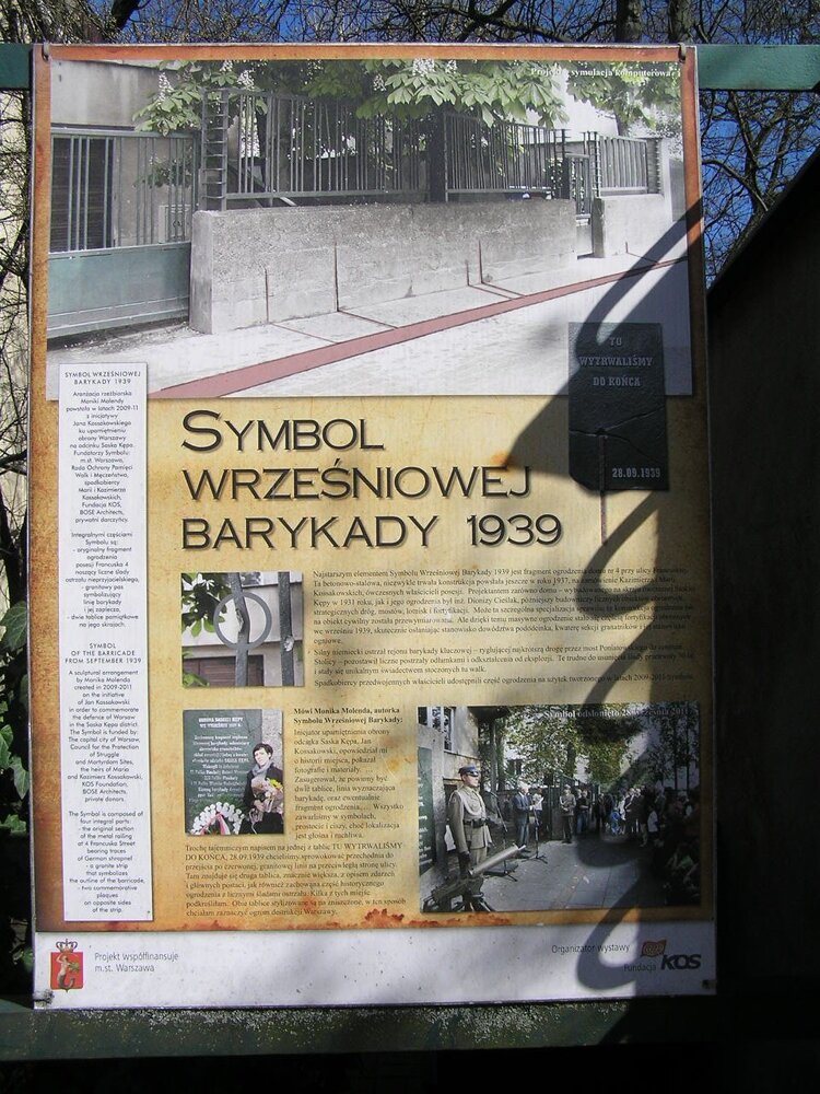 Dwie tablice upamiętniają dramatyczny czas obrony Warszawy we wrześniu roku 1939. Barykada została wzniesiona w pierwszych dniach września 1939 na skraju ówczesnej zabudowy Kolonii pod Dębem (dziś narożniku ulic: Francuskiej i Zwycięzców) po zaniechaniu obrony na linii Wału Gocławskiego i nieudanych próbach jego odbicia. Do 28 września 1939 skutecznie broniła dostępu niemieckiej piechoty i czołgów do centrum Pragi oraz przepraw mostowych przez Wisłę do lewobrzeżnej Warszawy.