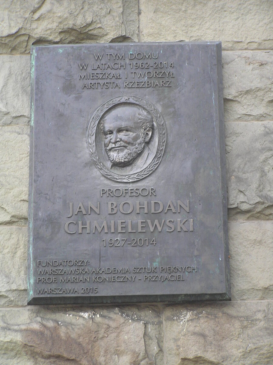 Tablica odsłonięta (od strony ulicy W. Skoczylasa) w 2015 roku powstała z inicjatywy Warszawskiej Akademii Sztuk Pięknych, ze szczególnym udziałem profesora Mariana Koniecznego - przyjaciela zmarłego profesora Jana Bohdana Chmielewskiego.