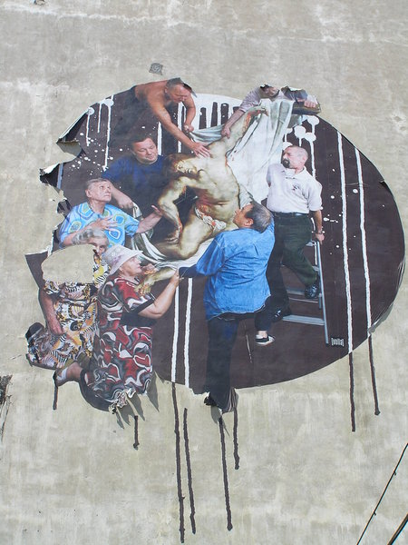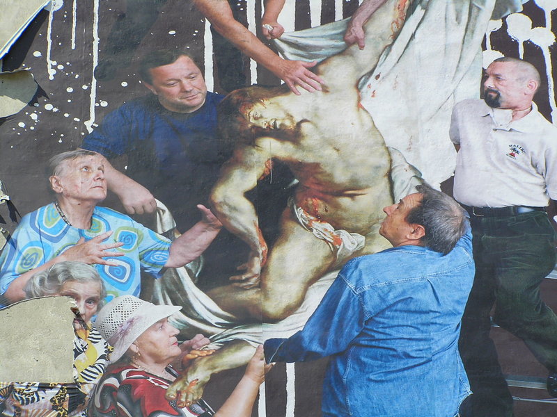 Chrystusa z krzyża zdejmują bywalcy Dziennego Domu Pomocy Społecznej przy ul. Brzeskiej, którzy pozowali artystce.
