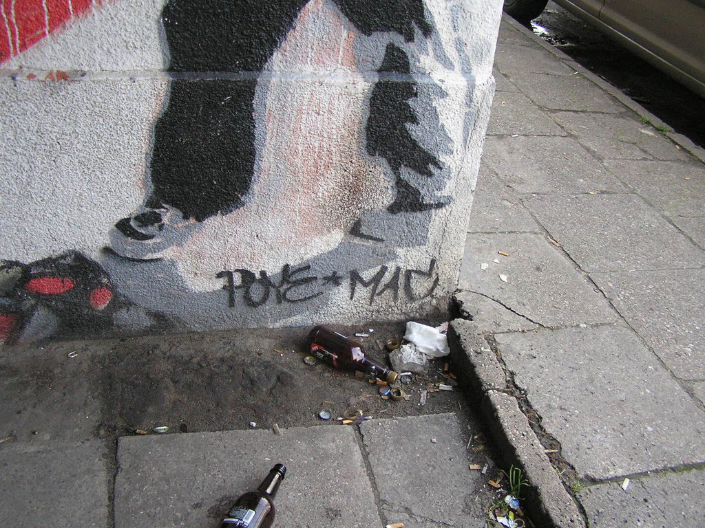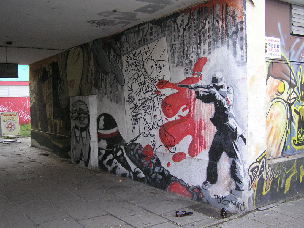 Mural powstał około 2012 roku. Na dole widoczny podpis: POYE * MAC.
