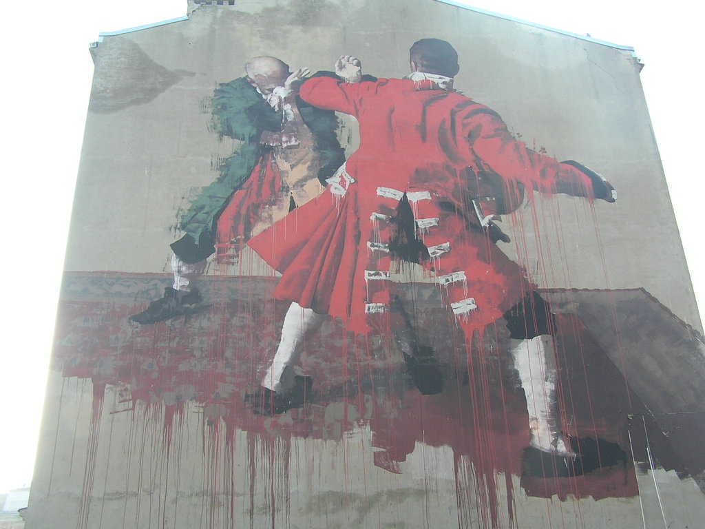 Mural przedstawiający dwóch mężczyzn naprzeciwko siebie, w strojach rodem z XVIII wieku, w pozach sugerujących pojedynek wzbudzał różne emocje. - Przecież to promocja przemocy – pisał radny Jacek Wachowicz w skardze do władz Warszawy - Kwestia interpretacji. To raczej przestroga przed używaniem siły – odpowiedział stołeczny Ratusz.