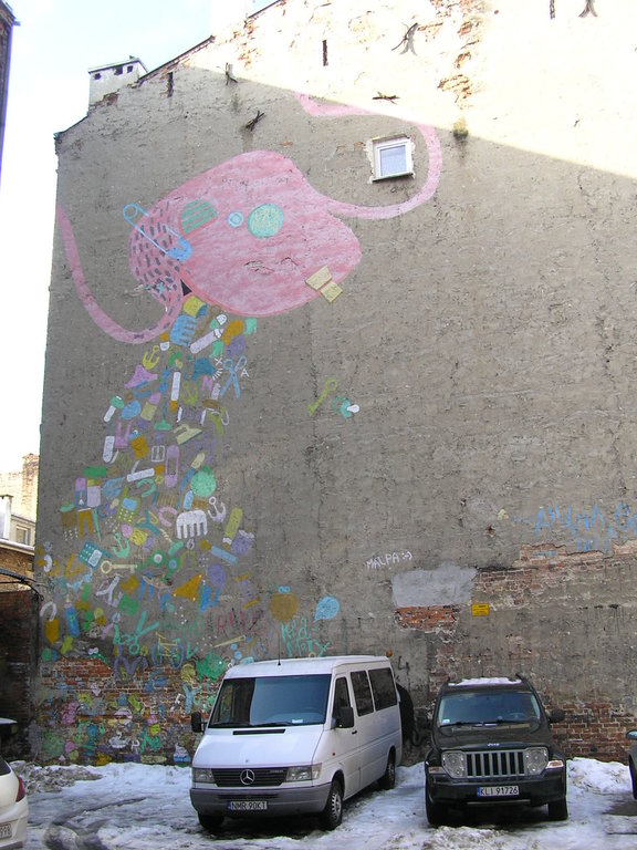 Dzieło stworzone przez Zuzannę Młotek oraz grupę dzieci z Grupy Pedagogiki i Animacji Społecznej (GPAS) ukazuje czerwoną Praską Torbę z której wypada wiele przedmiotów takich jak: klucze, serca, żelazka, telefony, ubrania, szpulki, szminki oraz kredki.