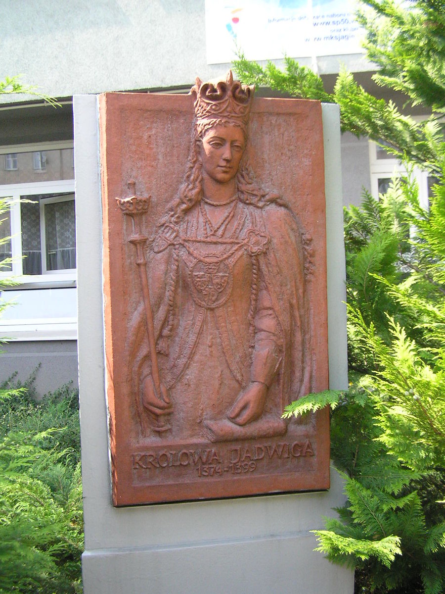 Płaskorzeźba została zawieszona na betonowym cokole przed wejściem do Szkoły Podstawowej nr 50 im. Królowej Jadwigi. Przedstawia wizerunek królowej od lata życia.