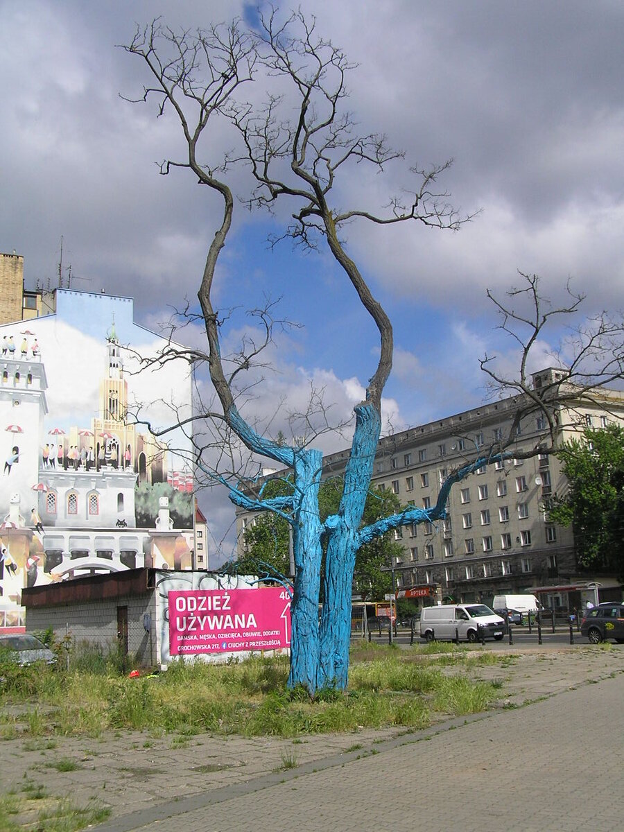 Przeznaczone do wycinki uschnięte drzewo zostało pomalowane niebieską farbą w dniach 14-15 maja 2022 roku przez Marku Sułka w ramach projektu "Warszawa Niezwykła - Praga Niezwykła" z serii "Stref Odrealnionej Rzeczywistości".