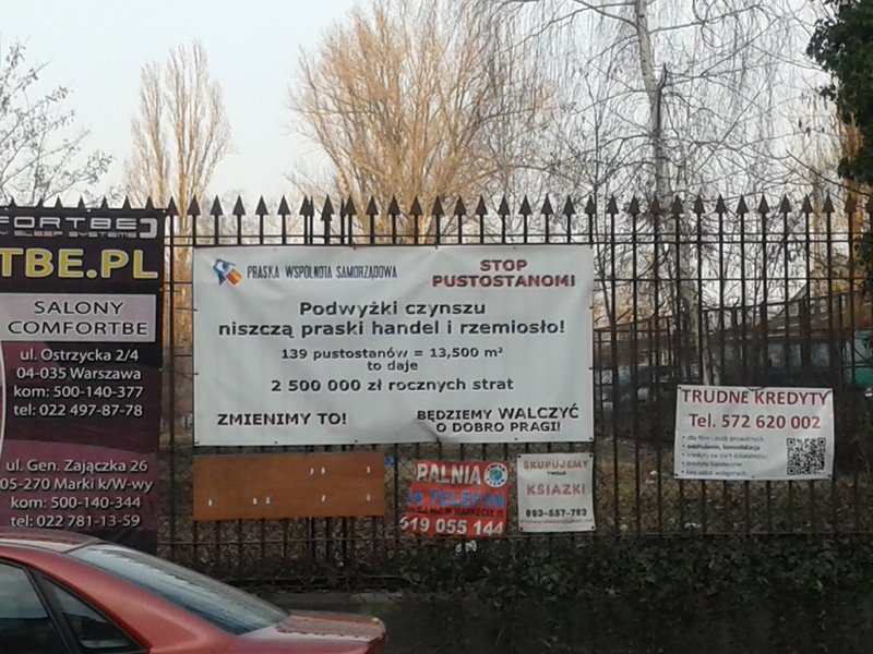 Kilkanaście metrów dalej, na metalowym ogrodzeniu, wśród kilkudziesięciu banerów reklamowych rozwieszonych chaotycznie wzdłuż ulicy Szwedzkiej bystre oko spostrzeże, że "podwyżki czynszu niszczą praski handel i rzemiosło". Gdy skręcimy w Stalową i przejdziemy jakieś 200 metrów, naszym oczom ukaże się piękna kamienica pod nr 41. Z jednej ze ścian z uśmiechem spogląda na nas lider praskich list wspominanego komitetu i informuje nas, że 16 listopada 2014 r. nastąpi "wyzwolenie Pragi".