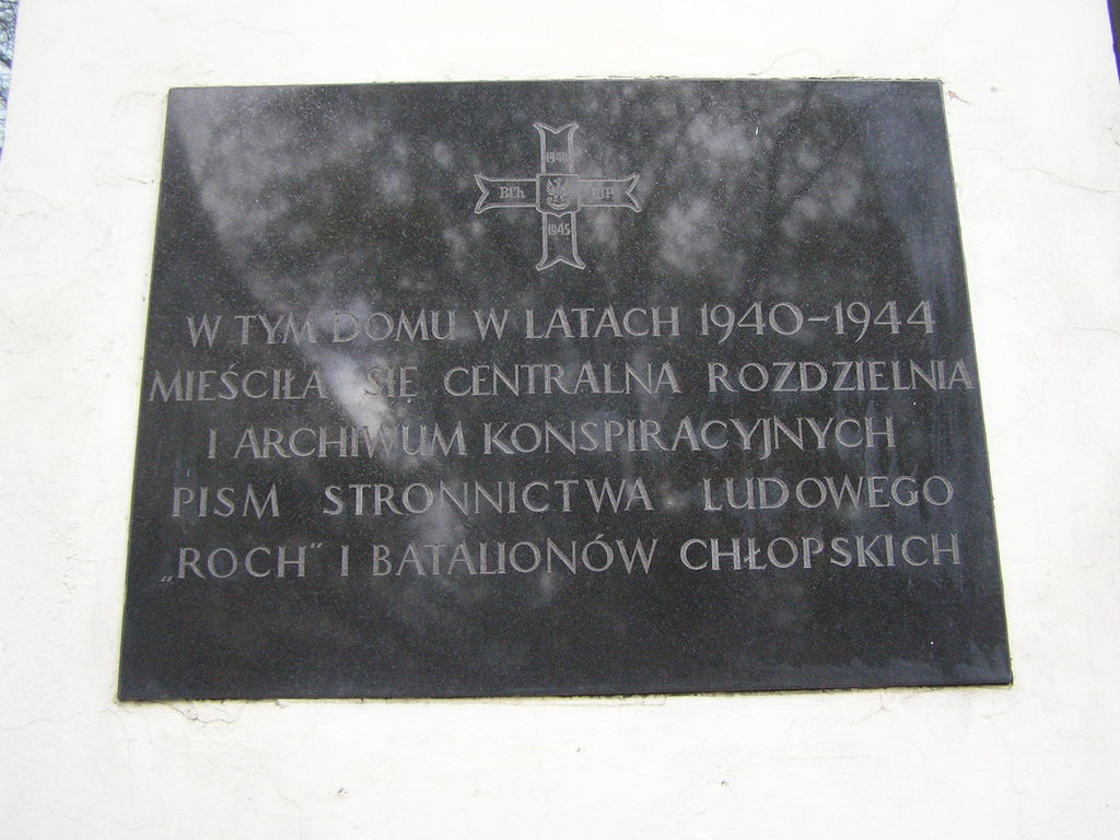 Tablica upamiętniająca Centralną Rozdzielnie i Archiwum Konspiracyjnych Pism Stronnictwa Ludowego "Roch" i Batalionów Chłopickich
