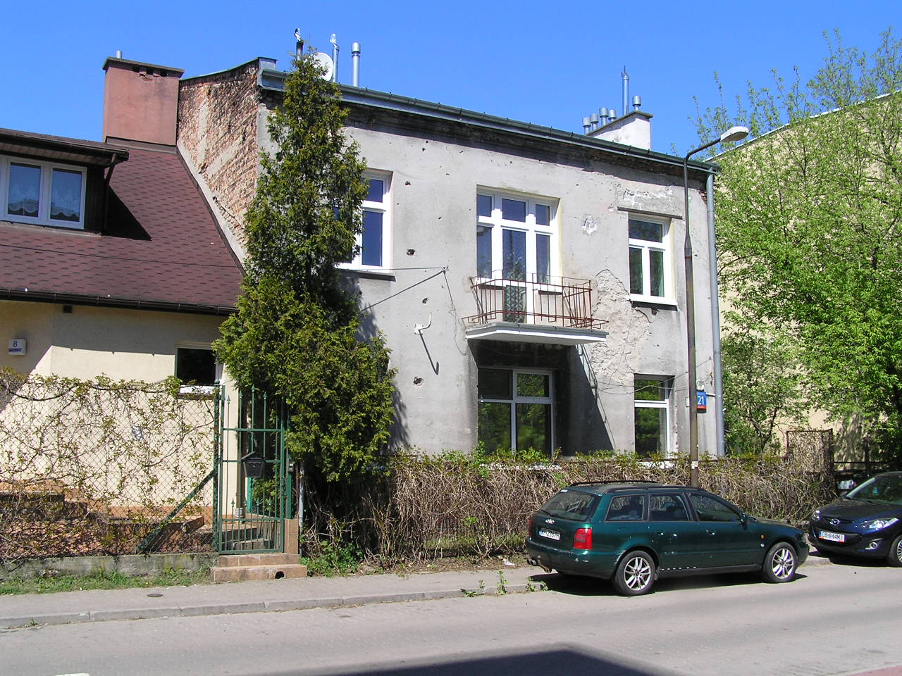 Na elewacji zachowane ślady walk z okresu II wojny światowej.