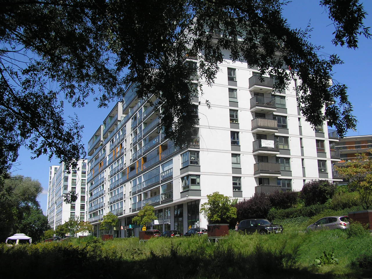 Budynek posiada kilkadziesiąt lokali mieszkalnych, lokale użytkowe w przyziemiu oraz podziemną halę garażową.