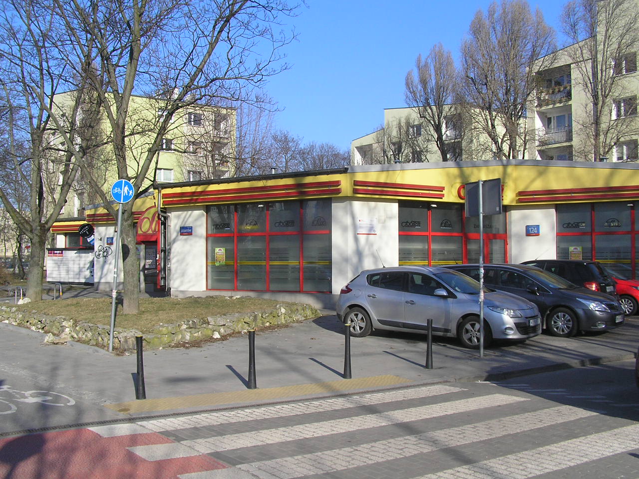 Parterowy pawilon handlowy w narożniku ulic: Szaserów i Romea i Julii został wzniesiony około 1960 roku. schodowych.