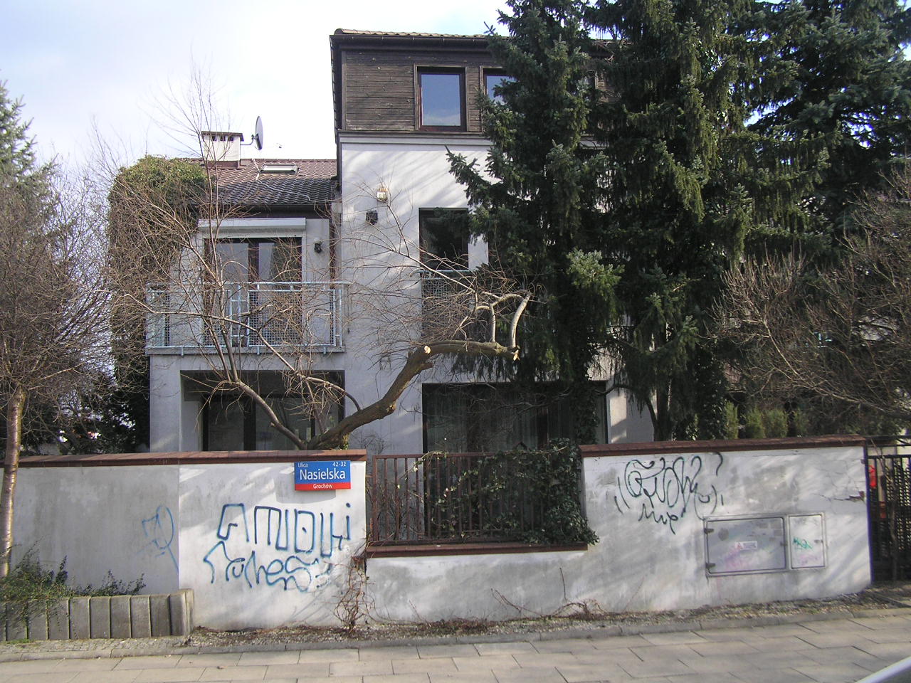 Dwupiętrowy dom w narożniku ulic: Boremlowska i Nasielska został wzniesiony na niezabudowanym terenie około 1995 roku.
