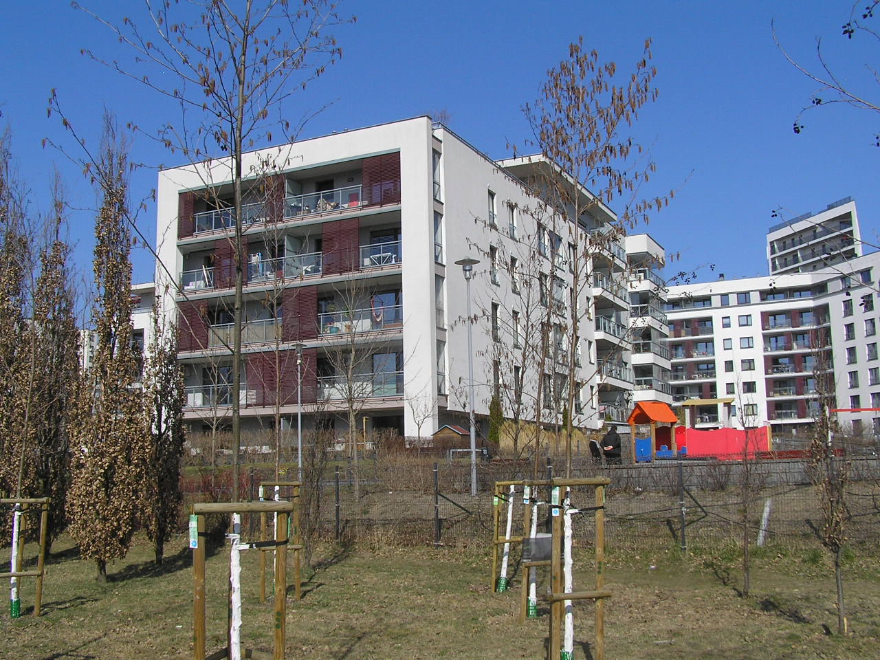 Posiada około 90 lokali mieszkalnych oraz podziemną halę garażową.